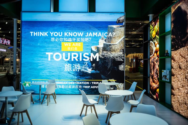牙买加馆的主题亦开门见山,“do business jamaica”(和牙买加做生意)。牙买加是加勒比海地区第一大海运中转港,其展台通过绿色和黄色的组合,呈现出如牙买加国旗一般的动感和活泼,将隆重推介其投资与营商环境。牙买加总理霍尔尼斯确认出席进博会开幕式及相关活动。