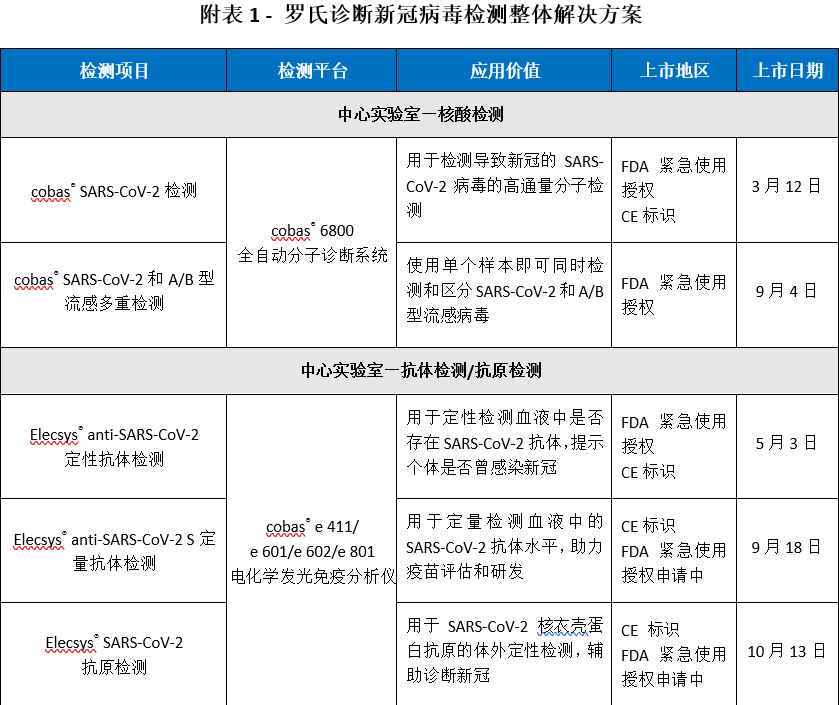 自新冠疫情爆发之初,罗氏诊断便迅速响应,率先研发并推出新冠病毒检测整体解决方案,其中包括病原学高通量鉴定新冠的cobas® SARS-CoV-2核酸检测,用于鉴别新冠和甲乙流的 cobas® SARS-CoV-2&Flu A/B三联检;适用于血清学检查的Elecsys® anti-SARS-CoV-2 定性抗体检测、Elecsys® anti-SARS-CoV-2 S定量抗体检测、Elecsys® SARS-CoV-2抗原检测;用于帮助识别可能产生严重炎症反应的高风险患者的Elecsys® IL-6检测、以及cobas® SARS-CoV-2和A/B型流感床旁快速检测,该检测使用单个样本, 20分钟内即可区分症状极其相似的SARS-CoV-2和A/B型流感病毒(具体产品及平台详见附表1)。截至目前,罗氏诊断的多款检测产品均获得FDA紧急使用授权(EUA),同时在认可CE标识的市场推出。据悉,罗氏新冠病毒整体解决方案的相关试剂可以分别在高通量 cobas 6800全自动分子诊断系统,cobas e 411/e 601/e 602/e 801电化学发光免疫分析仪,以及cobas® Liat® 系统等平台上,进行包括中心实验室和床旁快速检测在内的、精准、高效的检测,为全球抗疫前线的医务人员提供了重要诊疗依据。