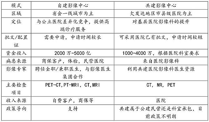 线下独立影像中心目前主要有两种模式,自建和与医院共建,两种模式对比如下: